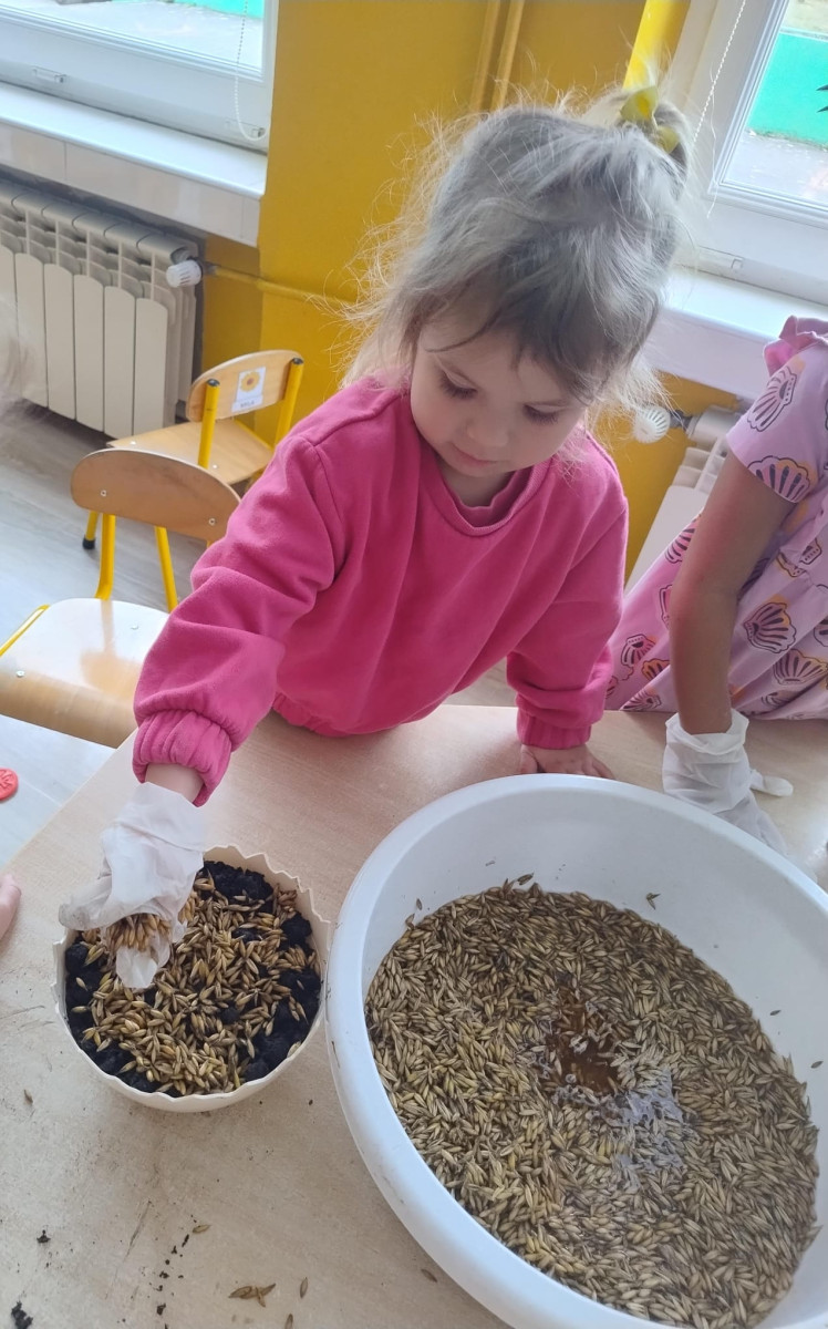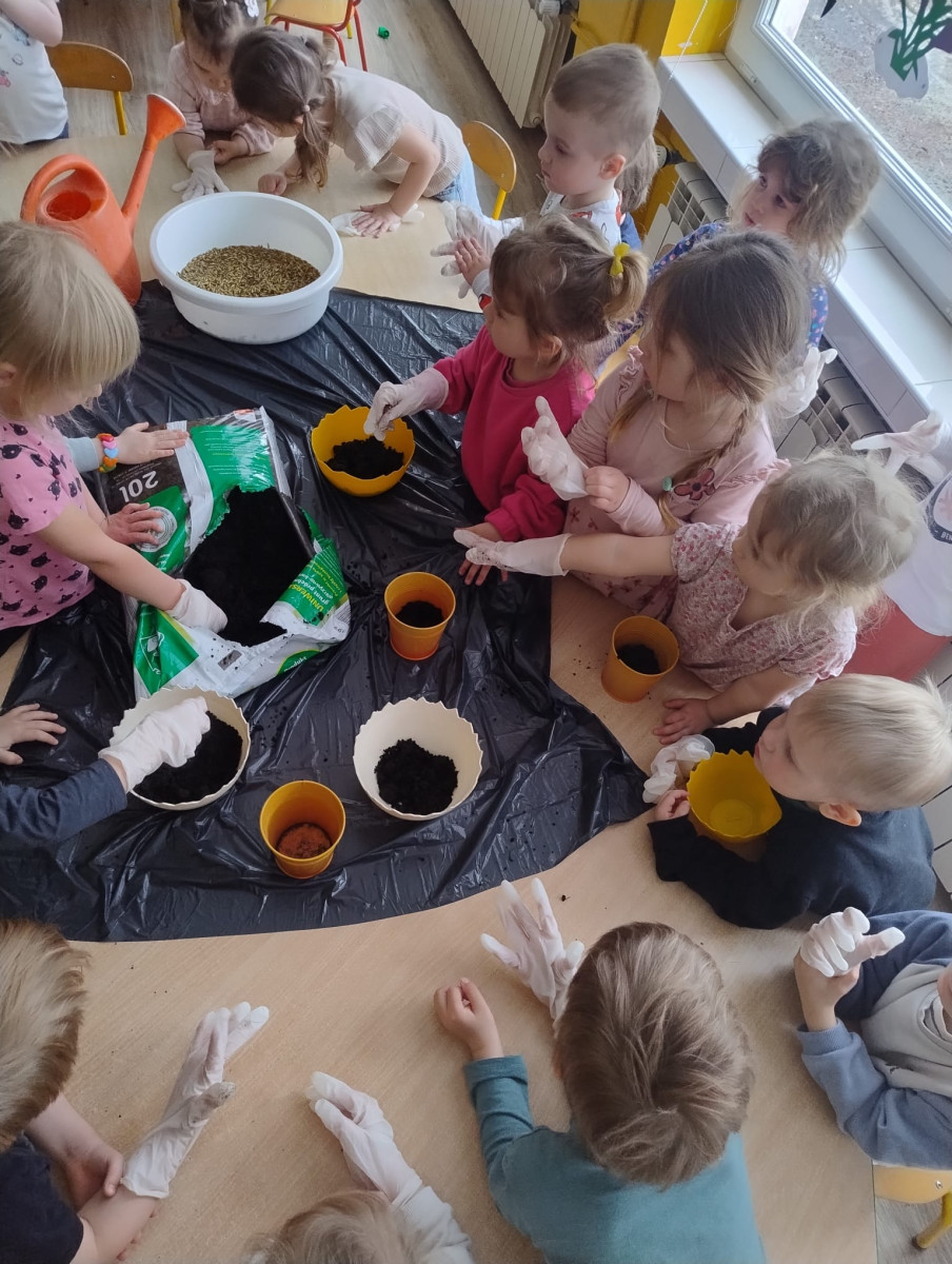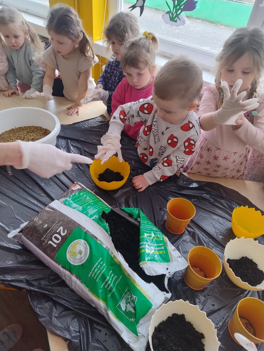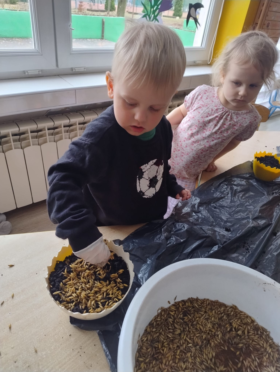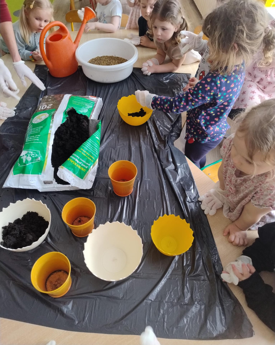 – samodzielnie wsypywały ziemię do doniczek, a następnie siały owies,