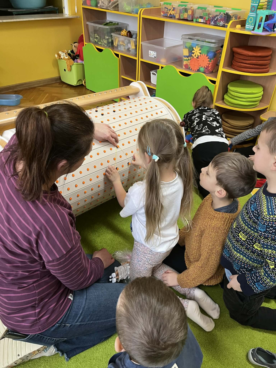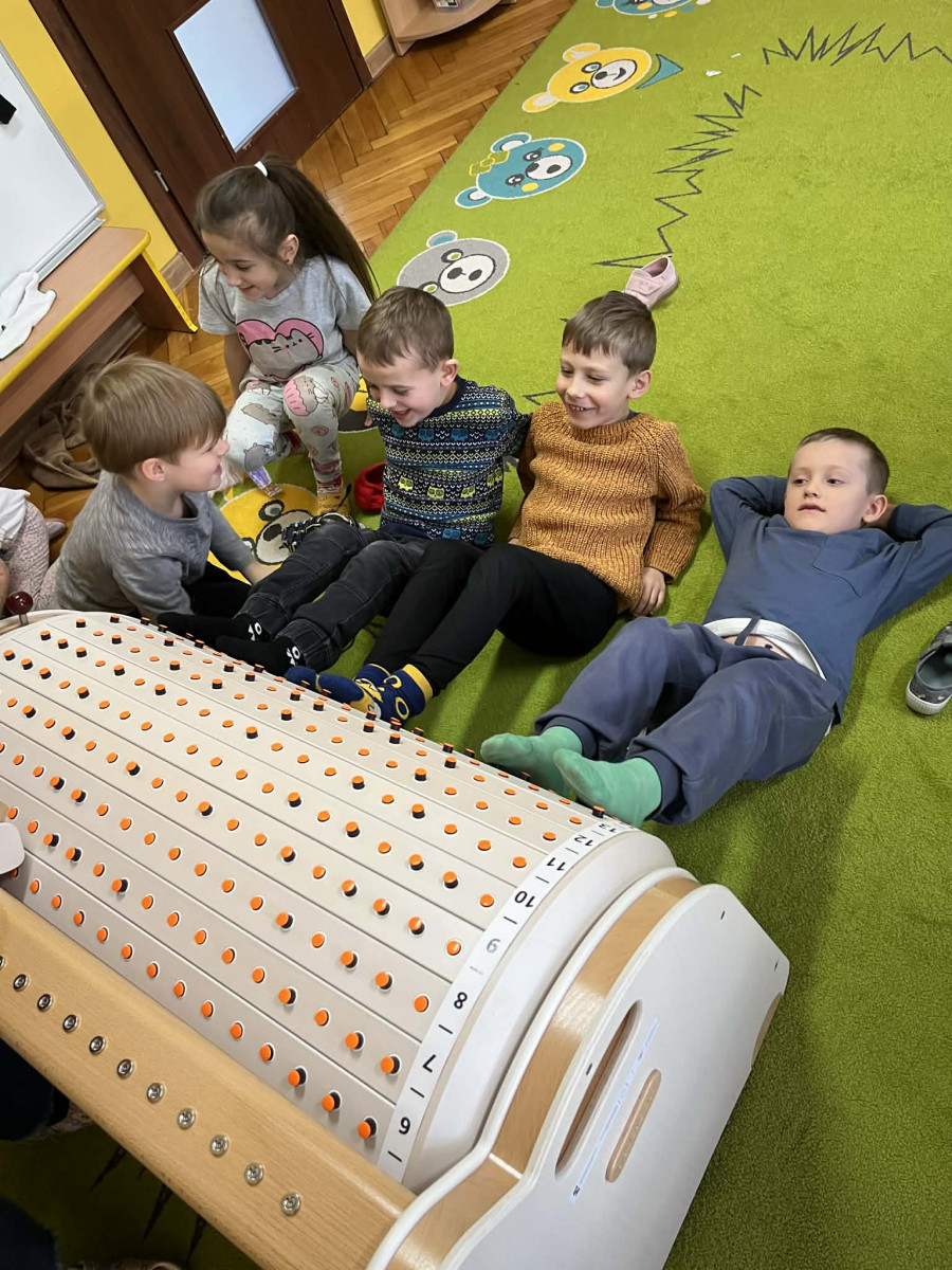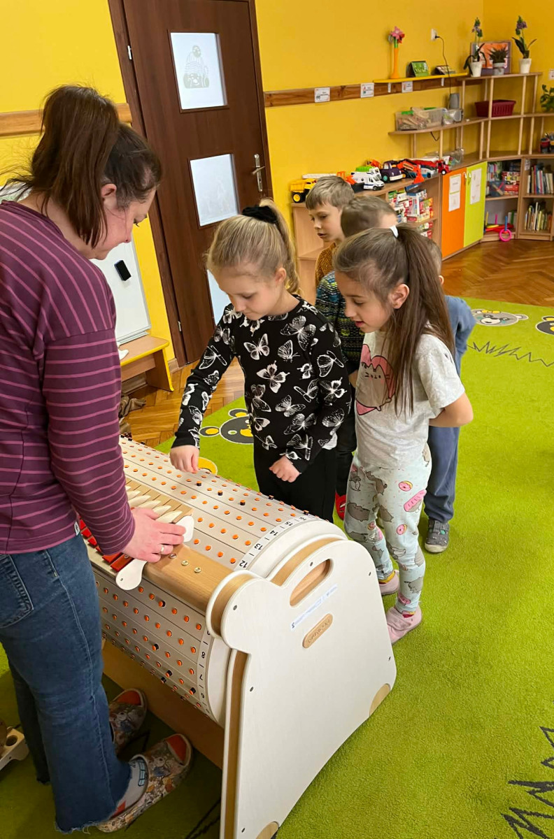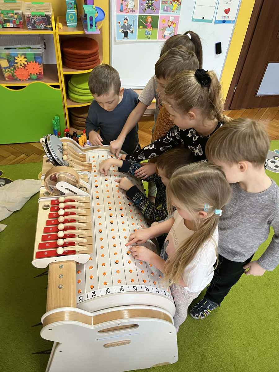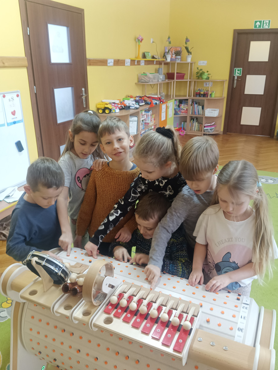 Dzieci z grupy Jeżyki miały okazję zapoznać się z Musicon – interaktywnym instrumentem, który łączy muzykę, ruch i naukę, rozwijając koordynację, koncentrację oraz wrażliwość słuchową. Jeżyki były bardzo zaangażowane.